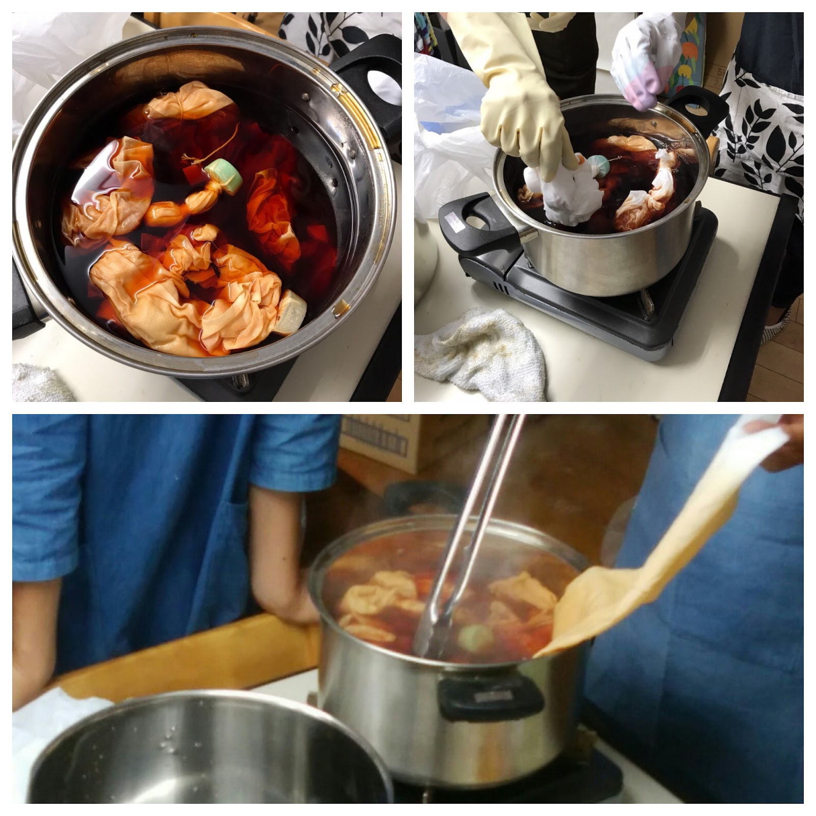 ・輪ゴムで絞りを作ったりと模様をつけた布を入れて煮出し、染めます。